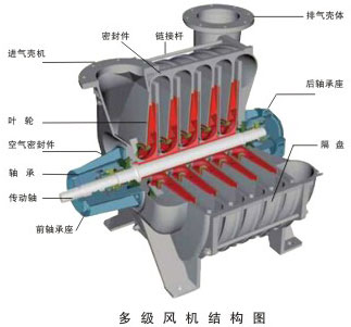 機殼材料采用HT250鑄件,經(jīng)過時效和熱加工處理,保證強度及材料分子結(jié)構(gòu)的穩(wěn)定性。機殼的主要部件由進氣機殼、中間隔盤、排氣機殼組成,它們采用橡膠密封圈密封,并通過煤油滲漏試驗,保證氣體不泄露。葉輪出口處設(shè)有擴壓器,進口處設(shè)有回流器,保證鼓風(fēng)機效率。為適應(yīng)各種不同所需壓力和流量,鼓風(fēng)機級數(shù)可采用2級-10級壓縮。進、出氣口位置根據(jù)用戶的需要,電機可以安裝在進氣端;也可以安裝在排氣端;法蘭面既可垂直向上,也可水平向左。