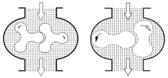 兩轉(zhuǎn)子在機(jī)體內(nèi)通過同步齒輪的作用,相對(duì)地呈方方向等速旋轉(zhuǎn)。鑒于葉輪與葉輪之間、葉輪與集體之間有適當(dāng)?shù)墓ぷ鏖g隙、使吸氣腔和排氣腔相互隔絕,借助于葉輪的旋轉(zhuǎn),行程無內(nèi)壓縮的地將機(jī)體內(nèi)的氣體由進(jìn)氣腔推送至排氣腔后,排出氣體達(dá)到鼓風(fēng)。
