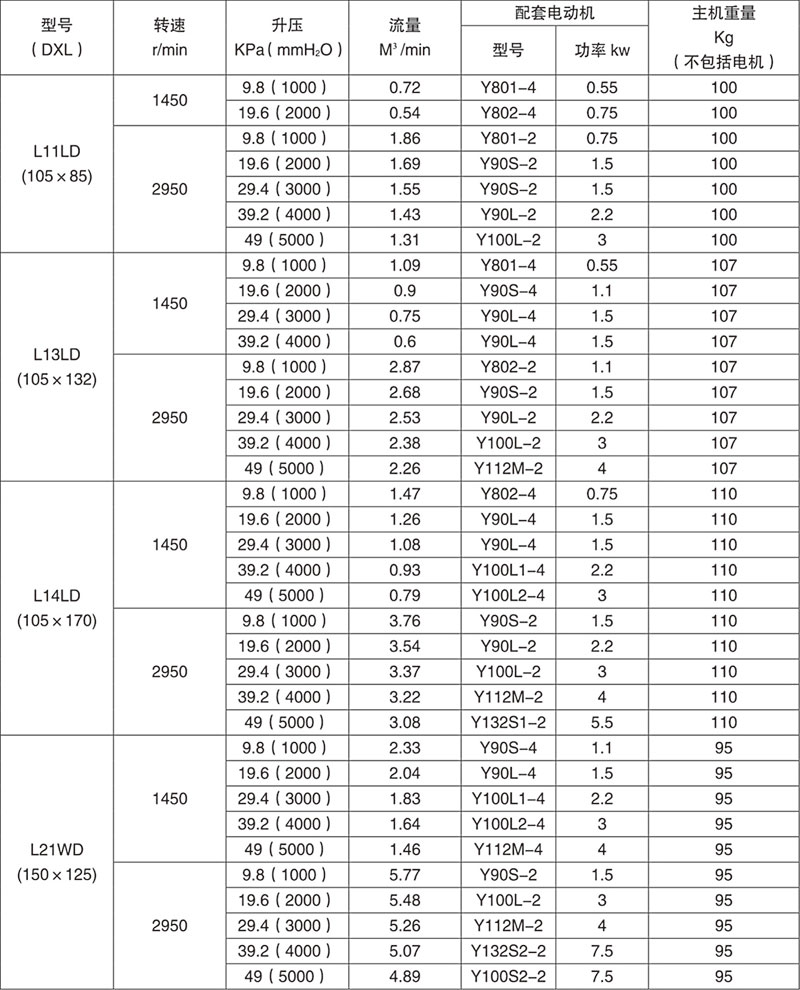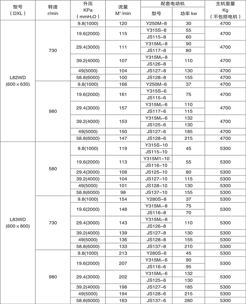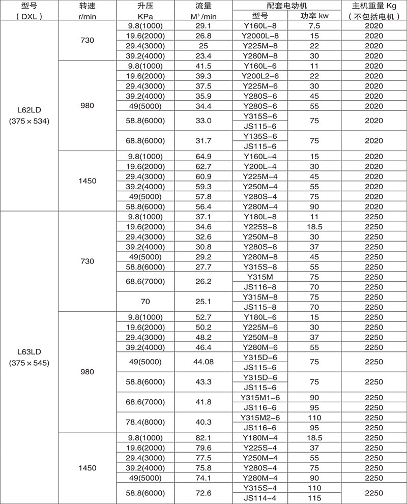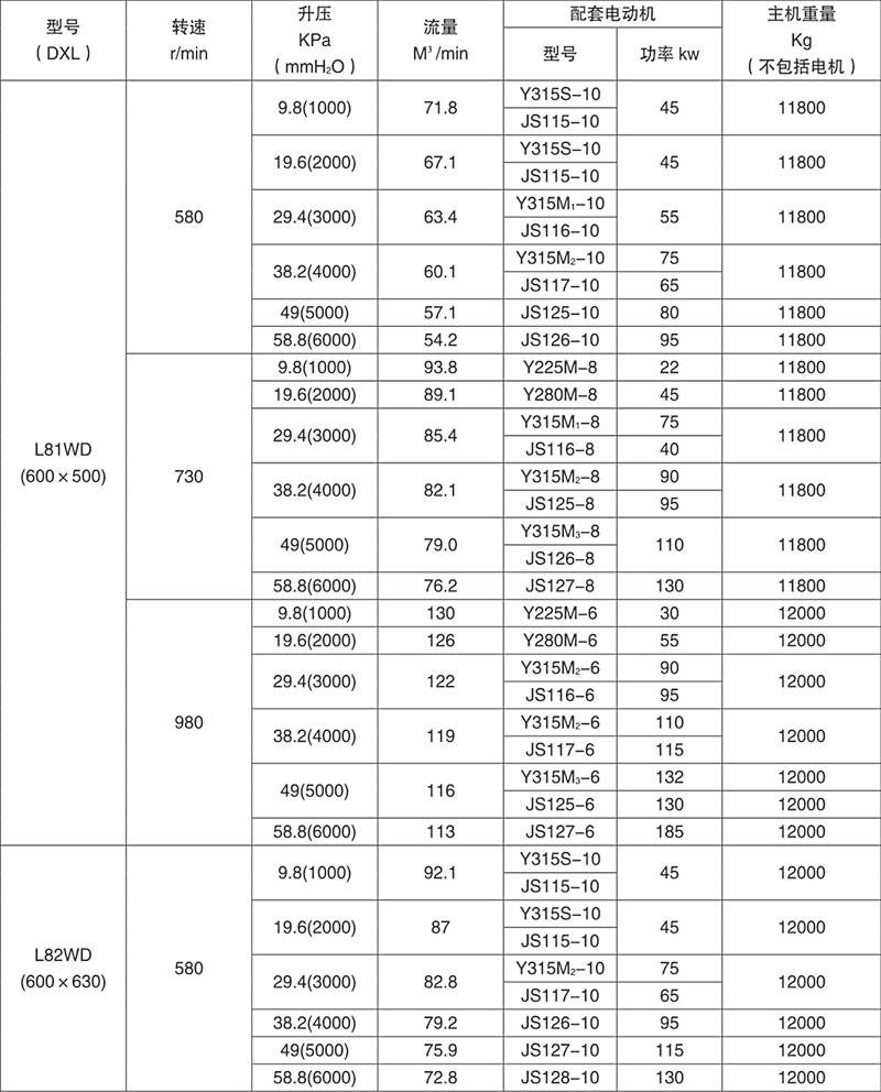 例:L84WD表示第8號(hào)機(jī)型(葉輪直徑為600mm,兩轉(zhuǎn)子中心距400mm),第4號(hào)葉輪長度)(1000mm),臥式、聯(lián)軸器直聯(lián)傳動(dòng)。