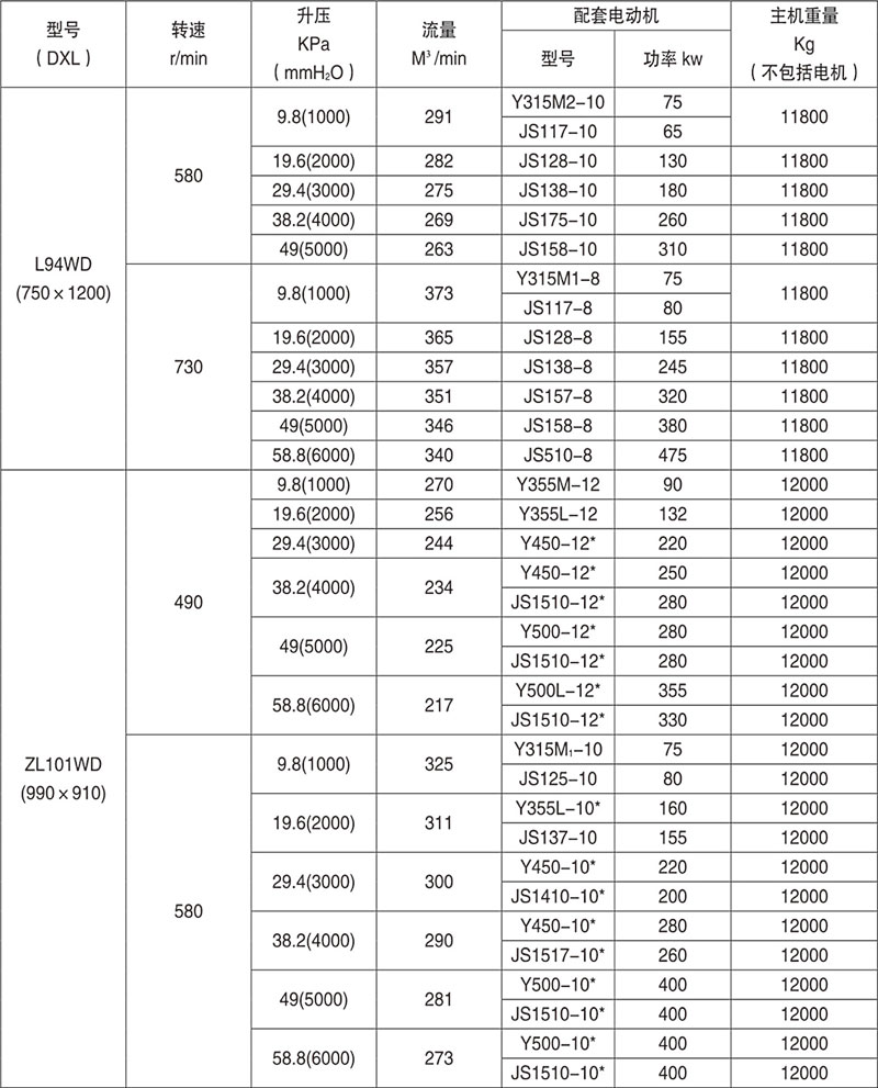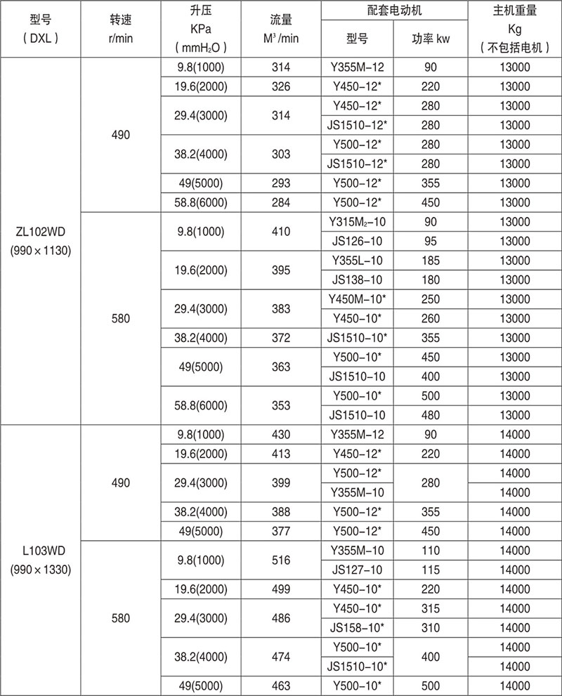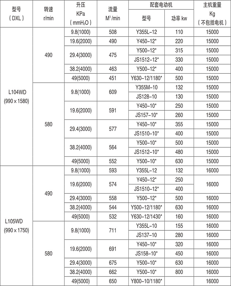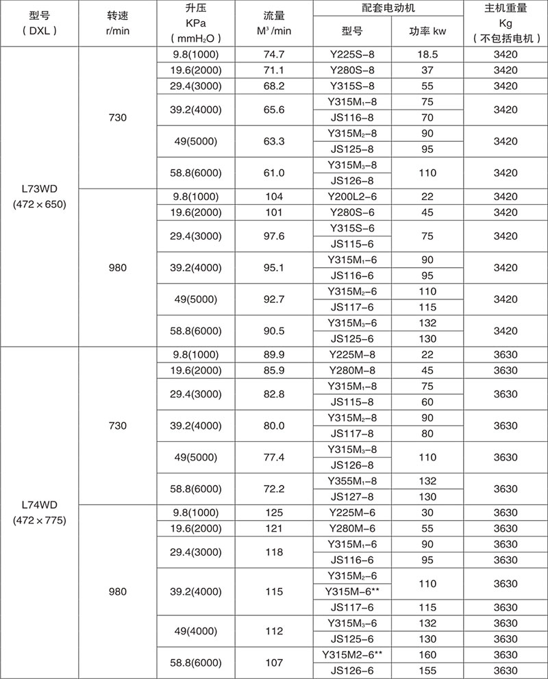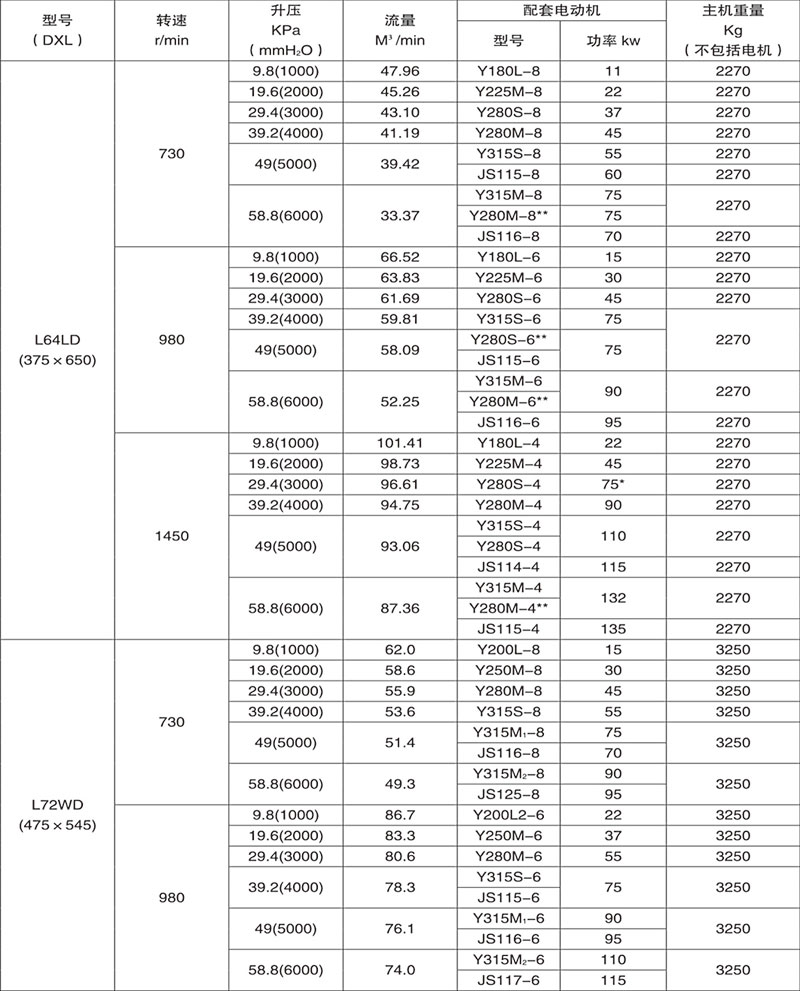 例:L84WD表示第8號(hào)機(jī)型(葉輪直徑為600mm,兩轉(zhuǎn)子中心距400mm),第4號(hào)葉輪長度)(1000mm),臥式、聯(lián)軸器直聯(lián)傳動(dòng)。